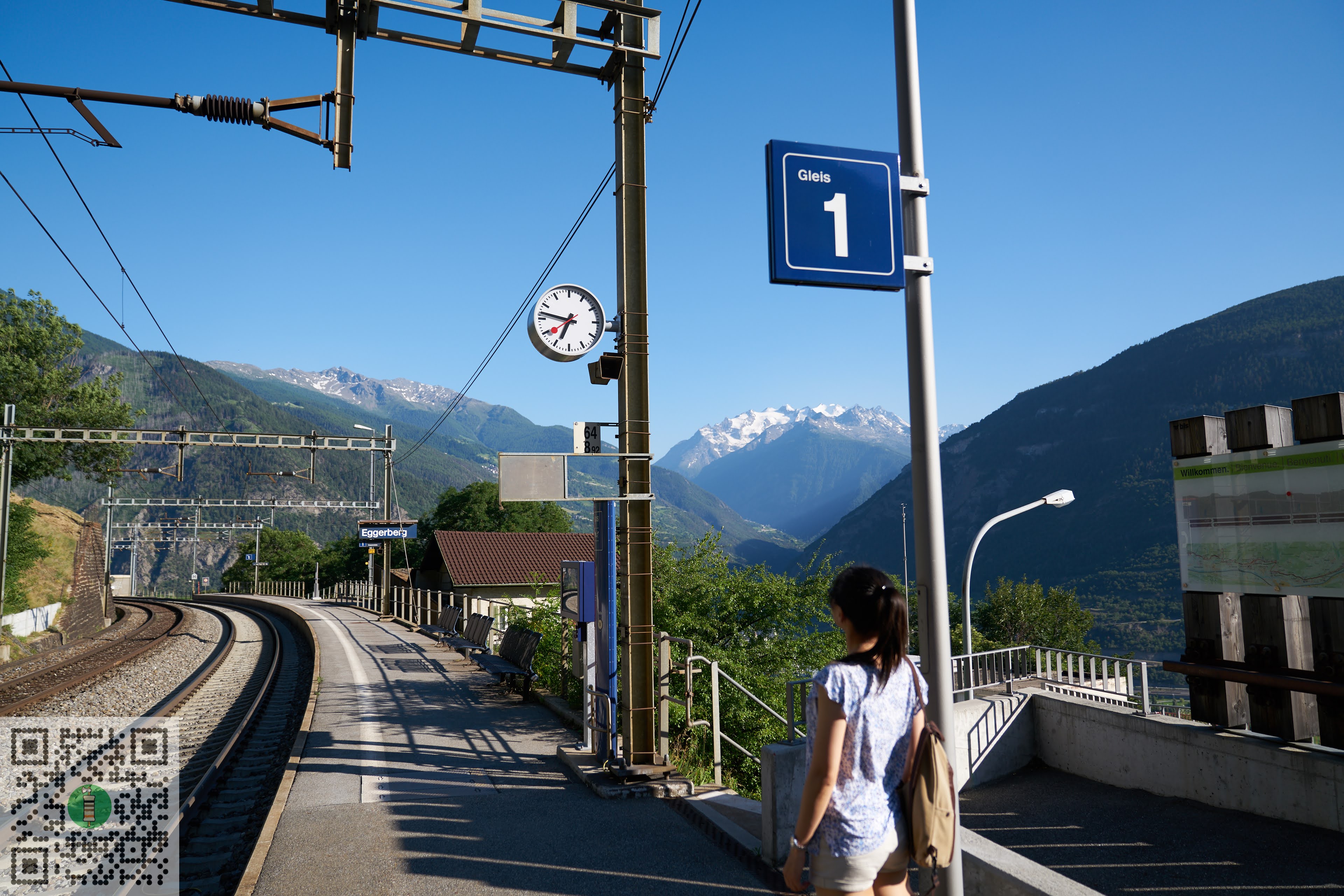 Switzerland has many convenient rail routes, even in the mountains. We chose to get off at Eggerberg station so as not to get too far from Brig. However, the temperature here was still high. Look! Passengers in front of us were wearing summer clothes.